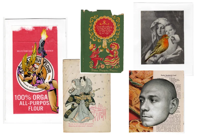 A five-card assortment of collaged cards with envelopes. Every card will be different. Images shown are examples of Jessica's work, but not the exact items you will receive.